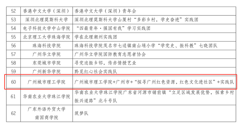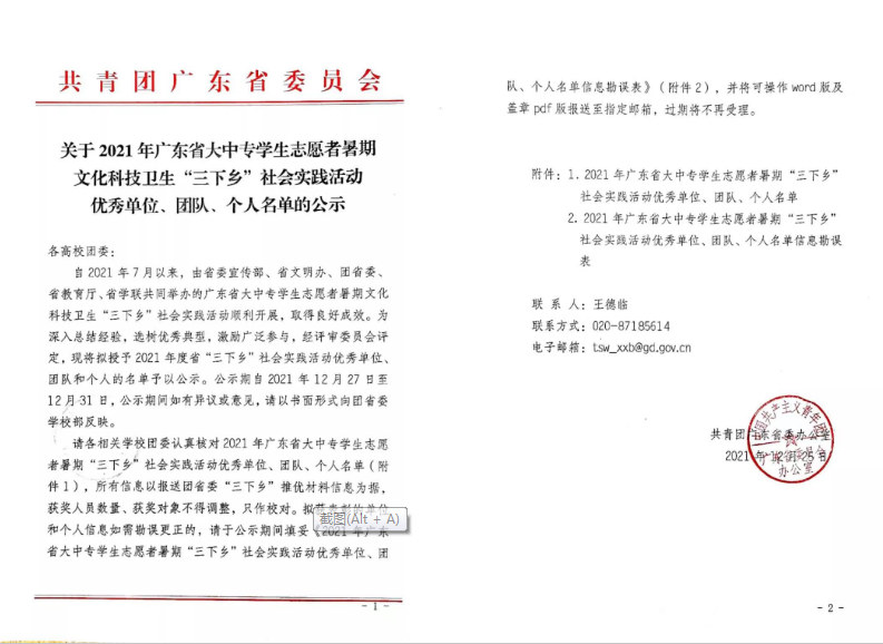 本网讯(记者 杨文娟)近日,团省委印发了《关于2021年广东省大中专学生志愿者暑期文化科技卫生“三下乡”社会实践活动优秀单位、团队、个人名单的公示》,我校广州市“探寻广州红色资源,红色文化进社区”实践队荣获优秀团队称号,李泳老师、温德城同学荣获优秀个人称号。