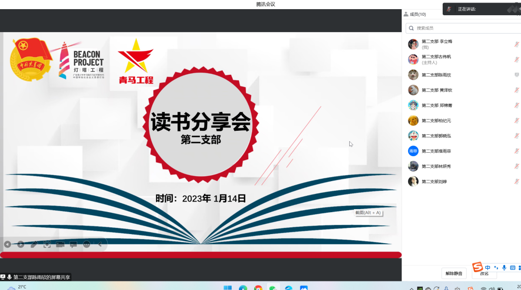 本网讯(记者 第二支部 李立梅)1月14日晚,广州城市理工学院第2期青年马克思主义者培养工程培训班第一次读书分享会通过腾讯会议形式召开,青马班全体学员参加了本次读书分享会。