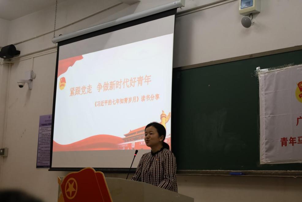 活动伊始,校团委书记王羽主讲团课《紧跟党走,争做新时代好青年》,她从党的二十大报告中习近平总书记对青年的寄语引入,结合《习近平的七年知青岁月》这本书,从“初到梁家河,面朝黄土背朝天”“立鸿鹄志,砥砺追求理想信念”“扣好扣子,树立正确的价值观”“勤学笃行,求真学问练真本领”“勇立潮头,在实践中创新创造”五个部分讲述了习近平总书记在陕北延安梁家河七年知青的经历。她讲到,在梁家河插队的7年里,习近平先后写了8份入团申请书、10份入党申请书,拉煤、打坝、挑类,什么不管脏活累活他都抢着干,成了“种地的好把式”、村民眼中的“好后生”,不论上山放羊还是下田锄地,他都不忘随身揣着书,抽空就读一会儿,并以“一物不知,深以为耻”的精神自我要求,抓住一切机会读书。