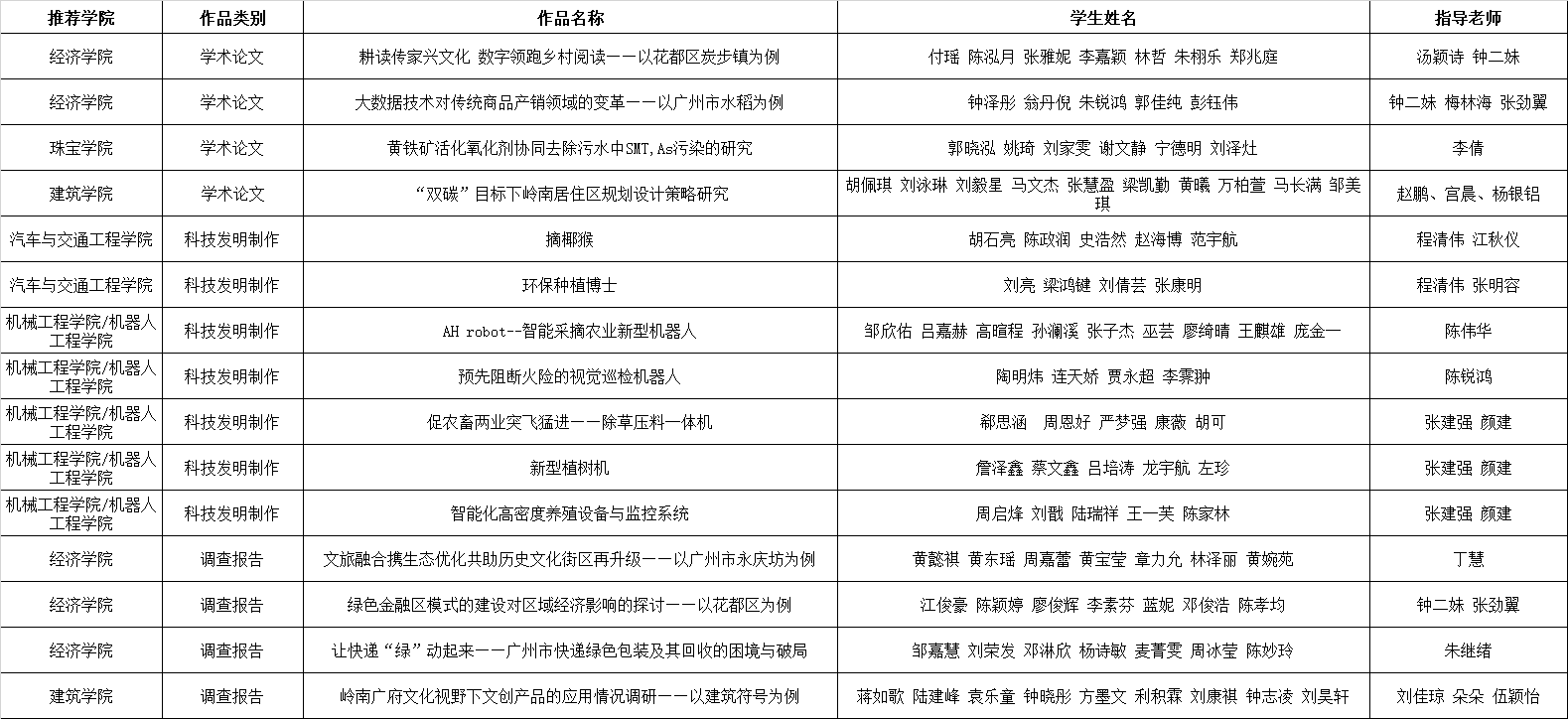 根据省团委《关于举办第十七届“挑战杯”广东大学生课外学术科技作品竞赛“绿美广东”专项赛的通知》要求,我校于2023年4月至6月组织开展了第十七届挑战杯“绿美广东”作品竞赛校级选拔赛,经学生团队报名,校团委组织评审对参赛作品进行评审,拟推荐以下作品参加省赛,现公示如下: