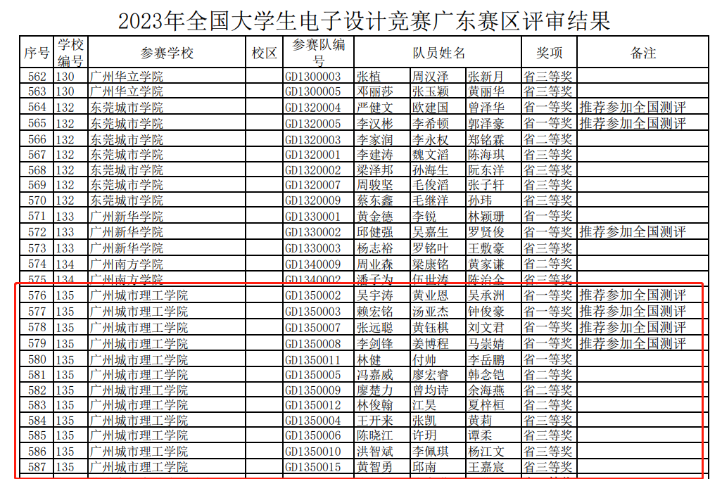 本网讯(记者 朱俊杰)8月10日,TI杯2023年全国大学生电子设计竞赛广东赛区结果公示,我校学子共获省一等奖五项、省二等奖三项、省三等奖四项的优异成绩,其中四支一等奖队伍被推荐参加全国测评。本次比赛我校共15支队伍参赛,队伍获奖率和一等奖获奖率均位居全省前列。