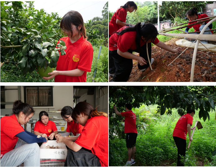 实践团成员们调研时发现,在荔枝树的生长过程中,也不乏有野草丛生,枝干杂乱的情况。在工作人员的指导下,实践团成员们积极行动,有的手持镰刀、有的手拿锄头,清理树下杂草,修剪树上枝干,减轻农户的劳作负担。