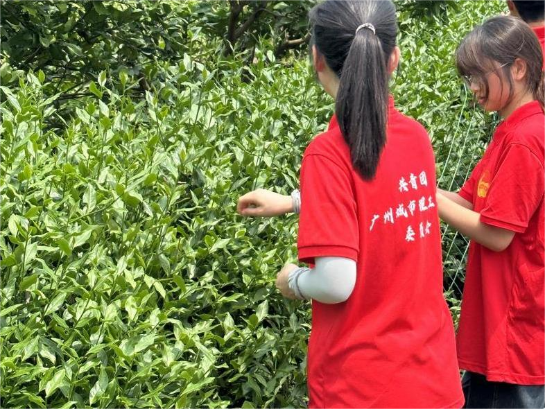 从化作为 “北回归线上的绿洲”,是著名的荔枝之乡,在荔枝种植加工这方面有着丰富的理论知识和实践经验。从化区荔博园创新加工形式,不只局限于传统加工制作荔枝干、荔枝酒的商品,还进一步推出了荔枝红茶等衍生品,以多种形式去促进荔枝产业链的一个延伸。荔枝红茶是采用英德英红九号鲜叶和从化新鲜的荔枝,经特殊工艺精制而成纯天然的果茶。实践团跟随从化荔博园支部书记邱晧烽的步伐,穿过蜿蜒曲折的山路,走进茶园区。荔博园党支部书记邱晧烽向实践团讲解道:“通常是采摘‘两芽一叶’,因为芽的部分比较嫩,做起茶叶来更清香、叶子更均匀”。实践团成员们认真领会采茶要领,变身“茶农”帮助荔博园采茶工人采摘茶叶。