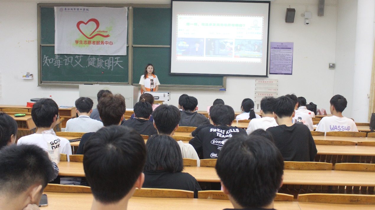 本网讯(记者 杨雪琼 韦嘉怡)为进一步宣传禁毒防艾知识,树立禁毒防艾意识,建设健康校园,提高学生对毒品与艾滋病预防知识覆盖率。5月9日,校团委学生志愿者服务中心联合花都区秀全街禁毒办、广州市北斗星社会服务中心在我校A5-107课室举办“知毒识艾,健康明天”宣传教育主题讲座。