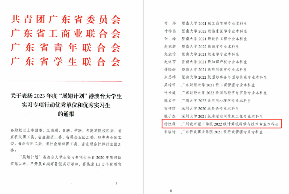 本网讯(记者 樊一眉 归李千慧)5月21日,共青团广东省委员会、广东省工商业联合会、广东省青年联合会、广东省学生联合会联合发文表彰2023年度“展翅计划”港澳台大学生实习专项行动优秀单位和优秀实习生,我校计算机工程学院2022级计算机科学与技术专业杨汶霖同学获得“优秀实习生”表彰。