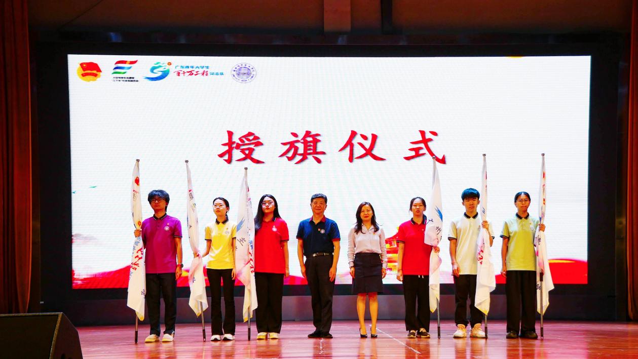 党委副书记、副校长刘洊波和团花都区委副书记吴湘宜为各学院突击队代表授旗(校团委宣传部 摄)