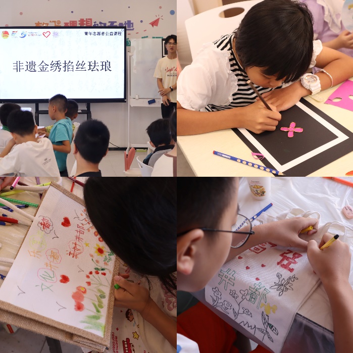 中华优秀传统文化源远流长,博大精深。实践团成员以专业赋能,开展非遗金绣掐丝珐琅、中国传统首饰文化、中华优秀传统文化等特色课程,为孩子们带来一场文化盛宴。孩子们在金绣掐丝和衍纸技艺相结合的手工活动中感受非遗文化的魅力;在“你眼中的首饰”绘画课中尽情设计属于自己的首饰;在绘制帆布袋时画出对自己家乡的美好祝福。