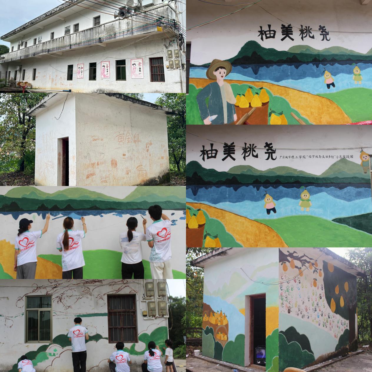实践团满怀热忱地投入到创作之中,成员们以柚子+乡村生活为主要元素,构思出一幅幅既富有乡土气息又不失艺术美感的画稿。墙绘过程中,同学们分工合作,有的精心调色、有的细致勾勒轮廓、有的专注填充细节,那一个个五彩斑斓的手掌印,是我校青年学子投身乡村振兴实践的青春印记。随着墙绘的逐渐成形,原本普通的墙面蜕变为余坑村的一道美丽风景,从金黄的柚子到蔚蓝的天空,从碧绿的青山到丰收的乡村景象,好山、好水、好柚、好人家,在画笔下跃然呈现,构成了一幅人与自然和谐共生的生动画面。
