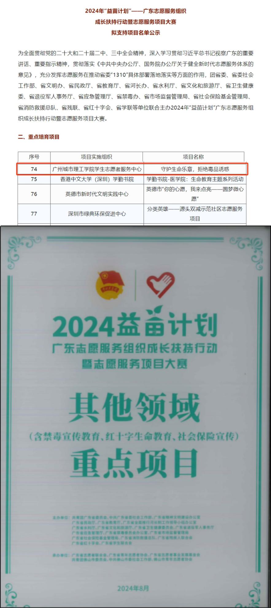 本网讯(记者 陈惠嘉 韦嘉怡)9月4日,由团省委、省社工部、省文明办等部门联合主办的2024年“益苗计划”——广东志愿服务组织成长扶持行动暨志愿服务项目大赛拟支持项目公示结束,我校“守护生命乐章,拒绝毒品诱惑”志愿服务项目经过校内推荐、省赛方案初审、集中培训、答辩复审等环节,在参评的954个项目中脱颖而出,获评2024年广东省益苗计划“重点培育项目”。