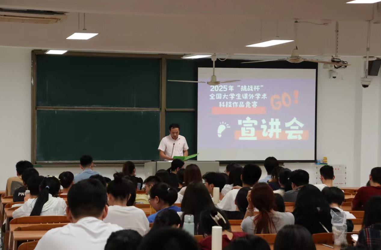 本网讯(记者 毕雨竹 高歌)为进一步营造校园科技创新氛围,鼓励广大学生积极参加“挑战杯”系列赛事,由校团委主办,电子信息工程学院/通信工程学院承办的“攀登大讲堂”第20讲——2025年“挑战杯”全国大学生课外学术科技作品竞赛校内宣讲会于10月10日晚在A5-301举行。电子信息工程学院党总支常务副书记罗自力,校团委书记王羽,校团委相关负责人以及300余名学生参加宣讲会。