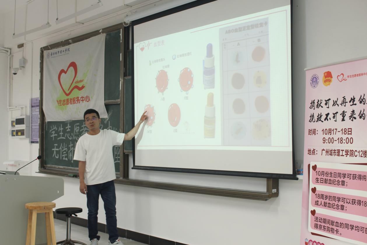 10月15日晚,在A5-201开展了无偿献血知识讲座,现场共有200余名同学参加。讲座伊始,全体观看无偿献血宣传短片,通过生动的案例讲解,让现场同学们认识到血液对于挽救生命的重要性。随后,广州血液中心医师陈端强依据自身专业背景和丰富的实践经验,从“什么是无偿献血”“为什么要献血”两个话题引发大家思考,再讲到“满足怎样的条件才能献血”“献血对身体的影响”两个同学们关心的问题,解答同学们对献血可能存在的疑虑。每个环节循序渐进,让现场同学们全面系统地了解无偿献血的基本知识,树立“无偿献血、无尚光荣”的意识。他也鼓励同学们要积极参与到无偿献血的行列中来,用自己的实际行动去践行社会责任,传递爱心和温暖。