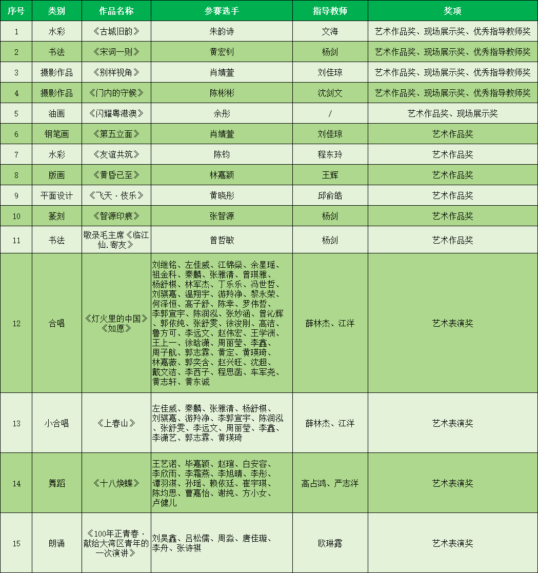 本网讯(记者 高占鸿)2月24日,广东省教育厅公布了第四届粤港澳大湾区大学生艺术节获奖名单,我校师生获得奖项24项,其中艺术表演奖4项、艺术作品奖11项、现场展示奖5项、优秀指导教师奖4项。