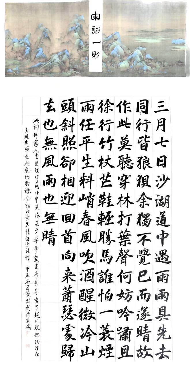 《宋词一则》以苏轼《定风波》入墨,笔势遒劲洒脱。作品通过传统书法艺术,不仅反映了苏轼在逆境中的坚韧和旷达,还体现了他对超凡脱俗人生的追求以及在坎坷人生中力求解脱的哲学思想。