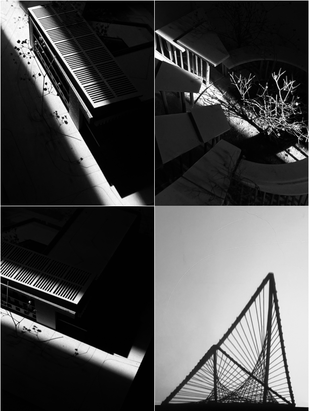 以光线为画笔,建筑模型为画板,阴影为调色盘。用不一样的视角看建筑,光影在建筑上的流动,也有抬头仰望建筑的角度,意在表现人类的目光流动于各个空间。
