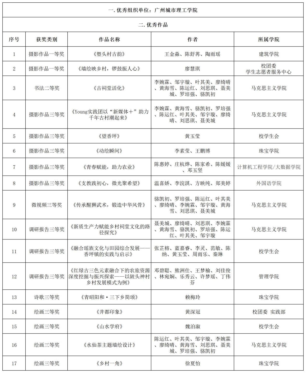 据悉,自活动启动以来,校团委认真组织、积极宣传策划,引导青年学生充分挖掘广东乡村历史记忆和乡村振兴实践成果开展社会调研、地情、思政教育,服务文化强省建设,助力广东省“百县千镇万村高质量发展工程”深入实施。2024年“多彩乡村 共谱新篇”系列实践活动主办方共收到各类作品15216件,经专家严格评审,评选出2469个优秀作品,105个优秀组织单位。
