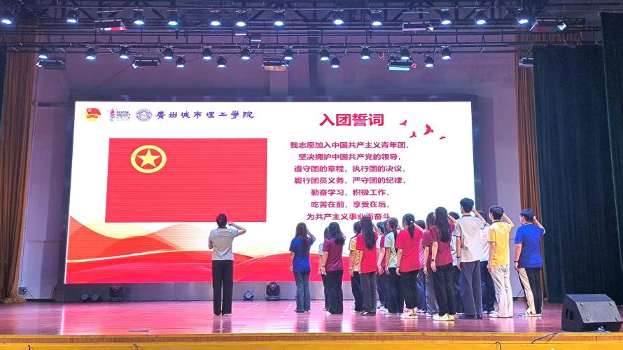 在第三篇章“成长”中,举行新发展团员入团仪式。计算机工程学院/大数据学院团委书记罗婉玲为新团员颁发团章,全体团员在樊一眉的带领下重温入团誓词。随后,珠宝学院2023级产品设计3班彭巧文作为新团员代表发言,她表示“青春力量是时代脊梁、未来的希望。成为一名团员,加入了共青团这个优秀的组织,这是对青年最大肯定和鼓励。如今历史的接力棒已经交到我们手中,需要我们每个青年在各自的舞台上踔厉奋发、勇担使命,用实际行动诠释入团誓言!”