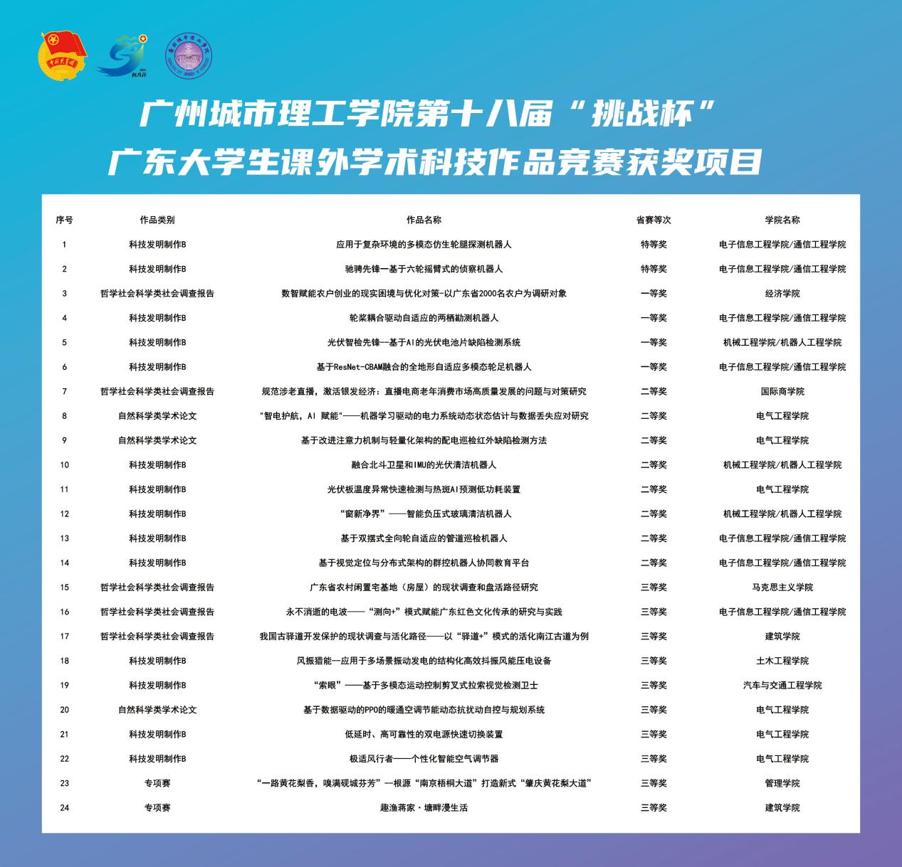 我校于2024年7月启动本届“挑战杯”赛事申报工作,经过严格筛选与层层选拔,共推报22件作品参加省赛主体赛,以及21件作品参加省赛肇庆“百千万工程”专项赛。备赛过程中,参赛师生团队在校团委的精心组织下,反复打磨项目,不断优化申报材料与演讲稿,力求在比赛中展现最佳水平。经过激烈角逐,我校在省赛主体赛中斩获特等奖2项、一等奖4项、二等奖8项、三等奖8项;在肇庆“百千万工程”专项赛中荣获三等奖2项,取得了优异的成绩!
