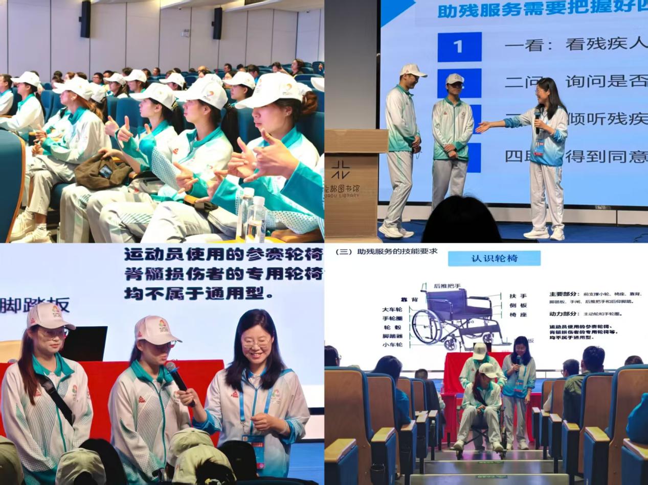 为更好地服务残特奥会,19名“小海豚”志愿者骨干参加助残服务专项培训,他们学习了无障碍沟通技巧、轮椅推行规范、视障引导方法等专业知识,更在实践中培养了细致入微的观察力和同理心。培训结束后,志愿者骨干将所学内容传达给每一名“小海豚”,全力保障赛事顺畅高效开展。