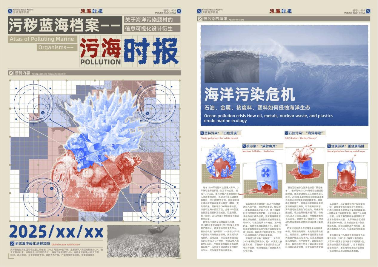 我校珠宝学院学生王奇瑞的作品《污海图鉴》旨在通过深入分析招贴艺术的发展历程以及海洋环境保护的相关资料,以招贴设计为核心创作形式,实现以海洋环境保护为主题的创意设计,着重探讨如何将海洋污染信息与海洋生物形象相结合,以视觉形态化的语言呈现海洋污染现状,传递生态保护理念。