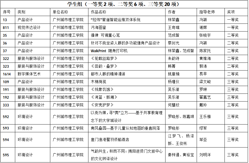 本网讯(记者 陈政甫)近日,由广东省教育厅主办的第八届粤港澳大湾区学校设计作品展暨第十届广东省高校设计作品学院奖双年展评选结果公示。我校珠宝学院、机械工程学院/机器人工程学院、建筑学院师生在本次赛事中表现优异,共获得38项奖项,其中一等奖2项、二等奖8项、三等奖21项、指导教师奖7项。