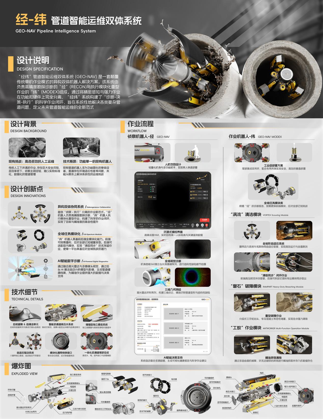 机械工程学院/机器人工程学院学生林荣鑫的作品《“经纬”管道智能运维双体系统》是一套颠覆传统单机作业模式的异构双体机器人解决方案。该系统由两款功能高度耦合的机器人组成:勘探机器人“经”(RECON) 负责进入管道进行三维测绘与无损诊断,生成高精度健康报告;作业机器人“纬”(MODEX) 则根据诊断数据,通过快速更换模块化的重型作业前端,对目标问题进行精准的物理清除。通过将精密感知与强力作业在功能和硬件上完全分离,“经纬”系统构建了“诊断-决策-执行”的科学作业闭环,从而能够系统性地解决传统方案难以应对的复杂管道问题。
