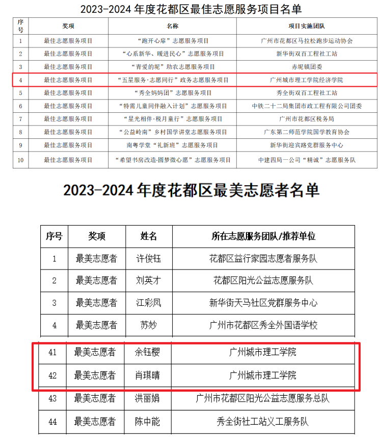 本网讯(记者 冯田丽)为大力弘扬志愿精神、传承雷锋精神,切实推动花都区志愿服务事业持续朝着高质量发展之路阔步迈进,厚植“志愿花都益 路有你”城市人文内涵,区文明办、团区委、区民政局联合开展2023-2024年度花都区学雷锋志愿服务月优秀志愿服务典型评选活动。3月5日,我校获悉评选公示结束,学校经济学院的“五星服务 志愿同行”政务志愿服务项目荣获“花都区最佳志愿服务项目”称号,计算机工程学院/大数据学院2021级的余钰樱同学和外国语学院2021级的肖琪晴同学被授予“花都区最美志愿者”称号。这是我校近年来持续加强精神文明建设,大力弘扬志愿精神,深入开展学雷锋活动取得的新成绩。